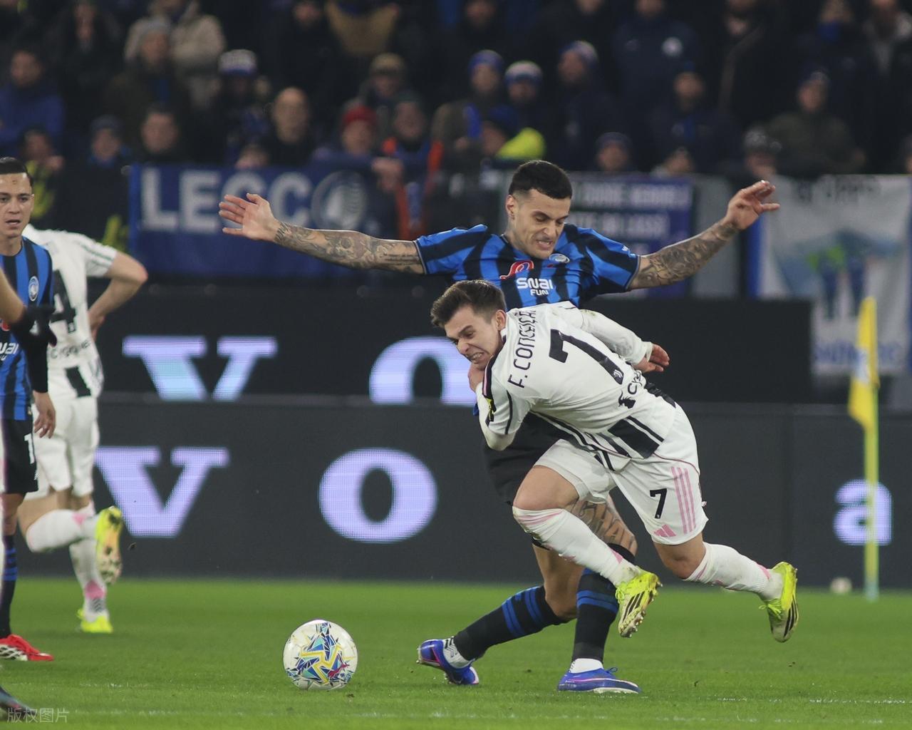 比赛开场阶段,尤文一度占据场上主动,攻势如潮。第19分钟,孔塞桑右路插上后的单刀射门被门将奋力扑出;仅仅1分钟后,这位葡萄牙边锋再度制造威胁,右路内切后的左脚暴射势大力沉,皮球重重砸在横梁上弹出,尤文距离打破僵局只差毫厘。彼时的斑马军团掌控着控球节奏,坎比亚索在左路的突破与洛卡特利的中场调度频频撕开亚特兰大防线,第34分钟的战术角球配合更是让亚特兰大禁区陷入混乱,戴维的横扫传球险些创造进球机会。但尤文“得势不得分”的隐患,终究在关键时刻爆发。
